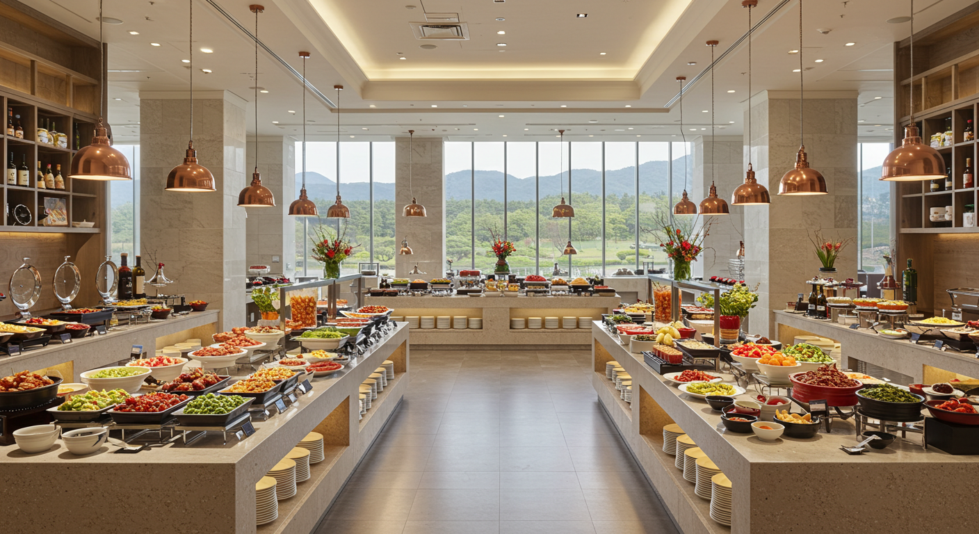 - 특징: 150여 가지가 넘는 다채로운 메뉴를 7개의 라이브 스테이션에서 즉석으로 즐길 수 있는 것이 특징이에요. 특히 양갈비, LA갈비, 대게찜 등 육류와 해산물 요리가 훌륭하다고 평가받고 있어요. 중식, 일식, 양식 등 모든 코너에서 만족스러운 맛을 제공하며, 다양한 종류의 디저트로 식사의 마무리를 달콤하게 장식할 수 있답니다.
